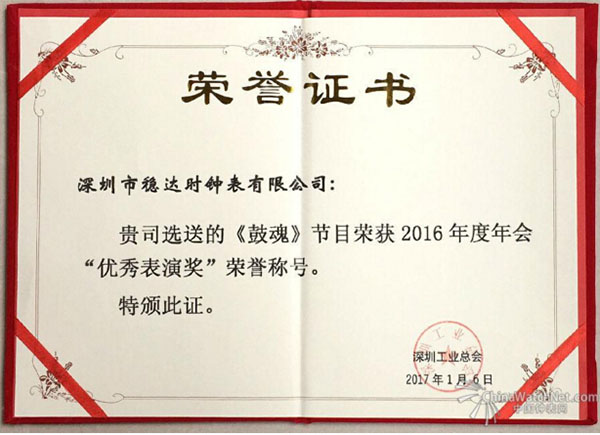 深圳穩(wěn)達時手表廠家選送的《鼓魂》節(jié)目,榮獲深圳工業(yè)總會2016年度年會“優(yōu)秀表演獎”榮譽稱號。
