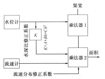 對矩形、梯形等斷面一定的明渠,利用水位測量可以求出水流的截面積。把壹臺或幾臺電磁流量計流速儀安裝在水路中,預(yù)先測量出流速儀得到的流速值和整個渠道的平均流速之間的流速分布修正系數(shù)及水深變化對流速的修正值。然后將渠寬、水深、平均流速修正系數(shù)和流速計所測量的流速值由計算機做乘法運算即可求出流量,如下圖為測量的原理框圖。