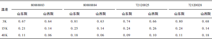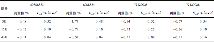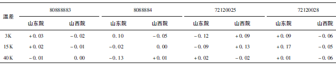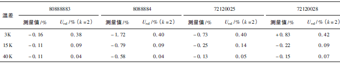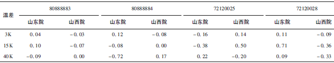 (1)熱量相對示值誤差測量結(jié)果中,兩院在15K點處與參考值的差值最大,山東院為+0.17K(72120028);山西院為+0.13K(72120025)。由于3K溫差對相對誤差來說要求較高,所以差值的擴(kuò)展不確定度也較大,為0.63%~0.81%。