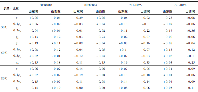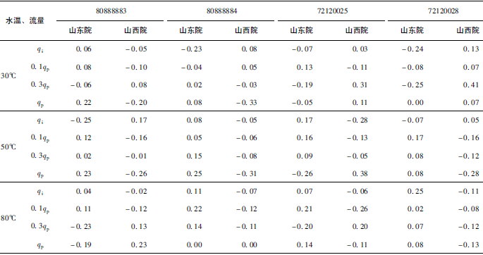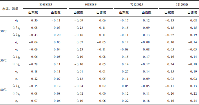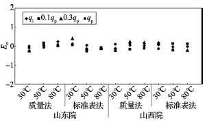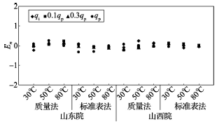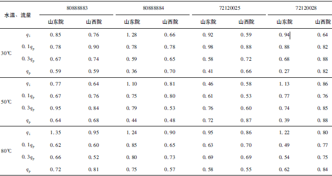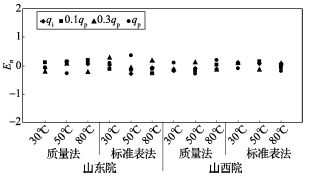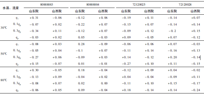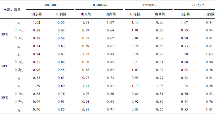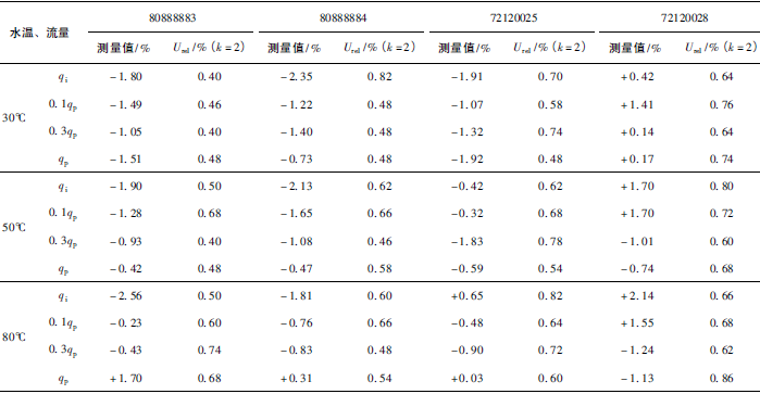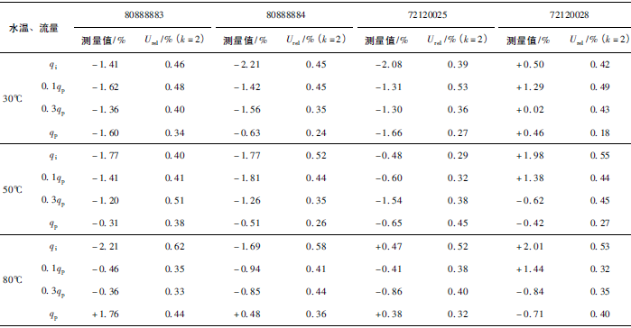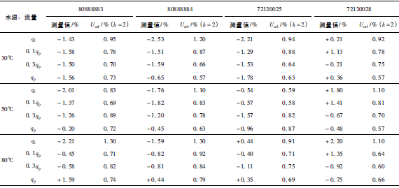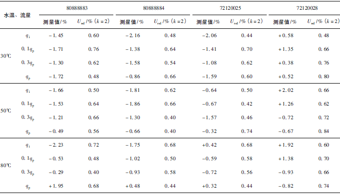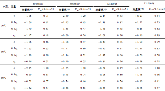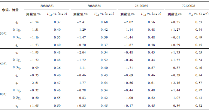 (2)累積體積(質(zhì)量法)相對示值誤差測量結(jié)果中,山東院在水溫80℃、qi點處與參考值的差值最大,為+0.31%(72120025);山西院在水溫30℃、0.3qp點處與參考值的差值最大,為+0.36%(72120028)。由于比對樣品在一些試驗點上的測量重復(fù)性不是很好,差值的擴(kuò)展不確定度最大達(dá)到了1.35%。