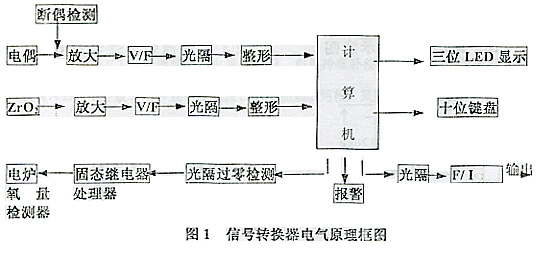 將來自氧量檢測器的模擬信號(hào)(氧勢(shì)、熱電勢(shì))分別調(diào)制成0-10KNz調(diào)頻信號(hào),經(jīng)光電隔離后送至計(jì)算機(jī),采用調(diào)頻方式能將儀表輸入、輸出相互隔離,這樣就消除了諸如大電流跳變所引起的干擾,能夠克服高共模電壓,因而大大提高了儀表的抗干擾能力。應(yīng)用程序主要由主程序和子程序組成,所有的程序都采用模塊結(jié)構(gòu)編制,便于修改、增加軟件功能,以滿足不同用戶的特殊需要。程序運(yùn)算采用了三位浮點(diǎn)數(shù),保證了運(yùn)算勞動(dòng)精度,對(duì)氧濃、爐溫的計(jì)算,采用查表線性插值法,對(duì)爐溫的控制采用增量式PID算式控制。信號(hào)轉(zhuǎn)換器的電氣原理框圖見圖1