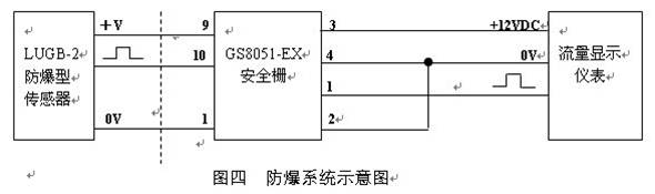 防爆型傳感器必須與合適的關(guān)聯(lián)設(shè)備——安全柵組成本質(zhì)安全型防爆系統(tǒng) (見下圖),通過電源信號安全柵再連接到流量顯示儀表上。
