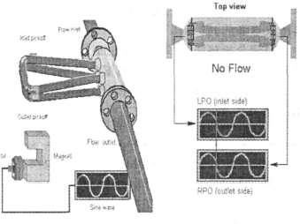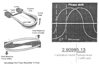 當測量管中有流體流過時,雙U型振動管由于振動方向相反,在科里奧利里的作用下,產生如圖2所示的扭動,該扭動的角度大小與流過振動管中流體的質量流量成正比,扭動的角度可以通過進出口檢測線圈檢測出來的信號相位差測得,即質量流量=流量計系數´相位差。
