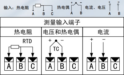 熱電阻:Pt100/Cu100/Cu50/BA1/BA2/G53;引線電阻補(bǔ)償范圍≤50Ω,熱電阻接線時(shí)A/B/C三個(gè)端子必須都要接上,B/C端子可以短接,C端子數(shù)目不夠時(shí),通道可以共用,接線如上圖所示。