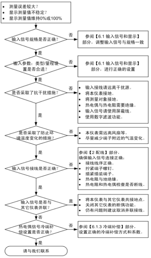 6.故障現(xiàn)象:接好電源以及信號(hào)后儀表顯示不是正常數(shù)值,顯示O.L/-O.L或者其他數(shù)值,輸入信號(hào)進(jìn)入后顯示值不變化。