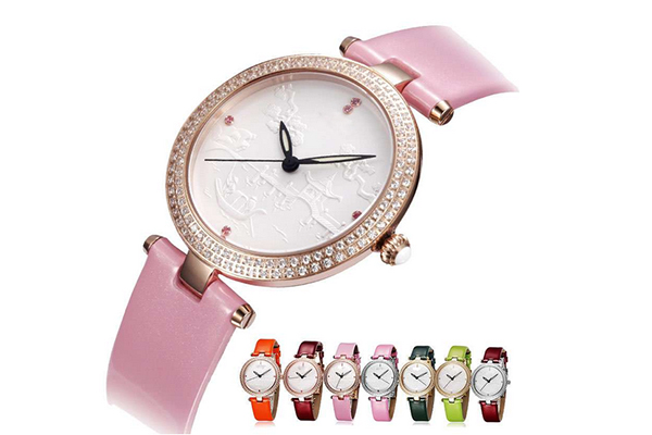 手表工廠設(shè)計(jì)的這款女士手表簡(jiǎn)約的設(shè)計(jì),采用超薄款式超薄機(jī)芯,讓女生佩戴舒適無(wú)壓力,款式簡(jiǎn)約,但卻處處暗藏“心機(jī)”,超薄表殼周?chē)脙扇κ┤A洛鉆石鑲嵌,簡(jiǎn)約的表面上無(wú)數(shù)字顯示,用5顆粉色鉆石來(lái)顯示3、6、9、12字位,表面上的繪畫(huà)栩栩如生,個(gè)性的表帶設(shè)計(jì)也是這款女士手表的特色。手表工廠的這款女士手表處處盡顯女士的優(yōu)雅氣質(zhì),實(shí)屬氣質(zhì)女性必備百搭配飾。