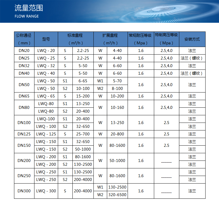 注:用戶在選型時(shí),應(yīng)根據(jù)管道公稱壓力、介質(zhì)最高壓力、介質(zhì)溫度、介質(zhì)組分情況、流量范圍及信號(hào)輸出要求合理選擇流量計(jì)的型號(hào)規(guī)格。為使流量計(jì)的使用性能,流量計(jì)的使用流量范圍應(yīng)在(20%~80%)Qmax范圍內(nèi)比較合適。